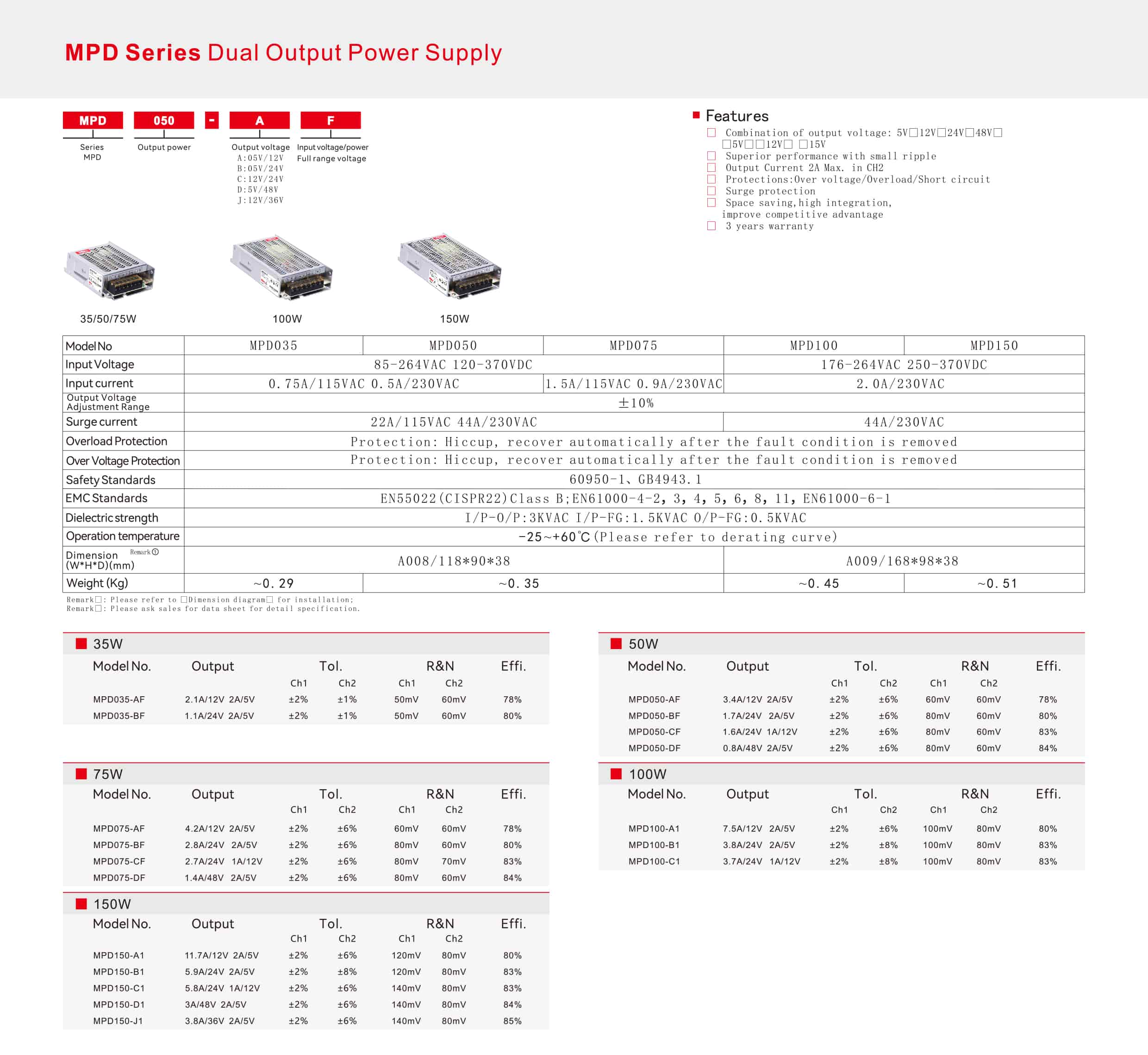 • Kết hợp điện áp đầu ra: 5V、12V、24V、48V、±5V、±12V、 ±15V